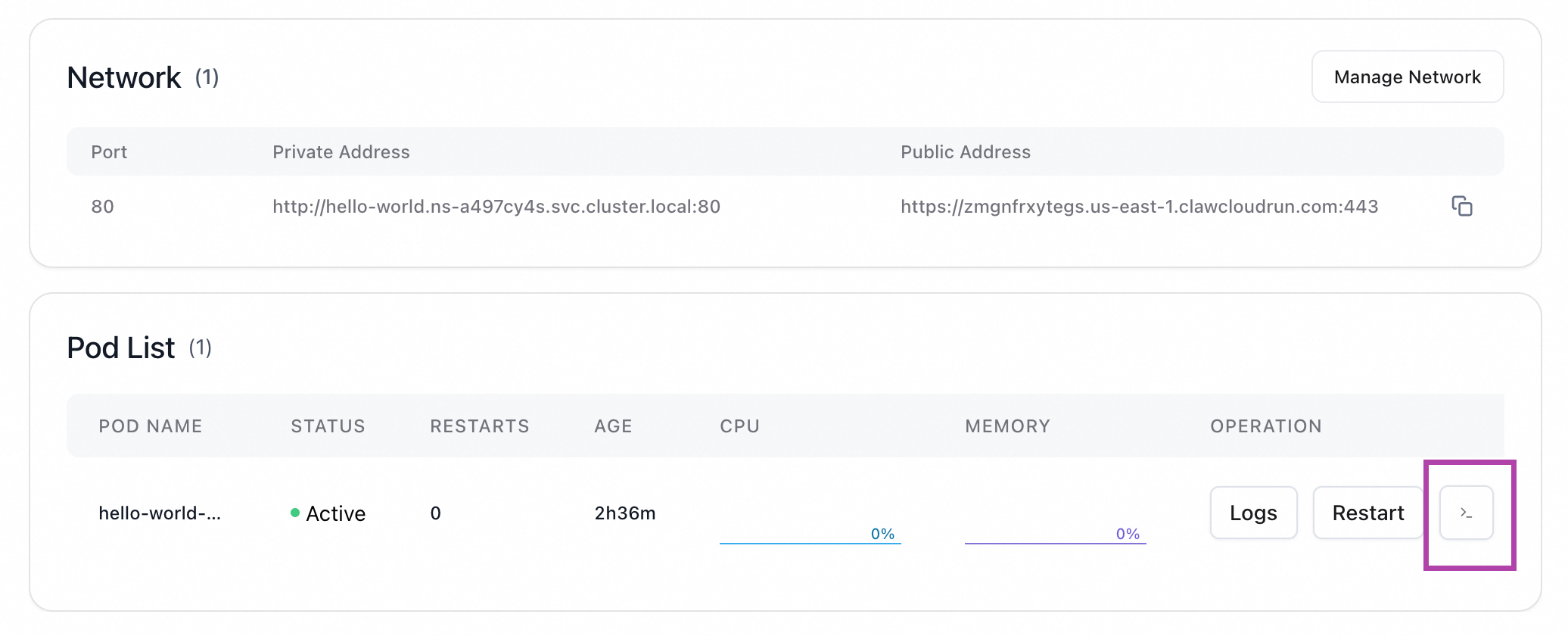 ClawCloud Run's **Terminal** feature provides secure, browser-based access to your application containers. Designed for developers and operators, it allows direct interaction with running environments without requiring local CLI tools or SSH configurations.